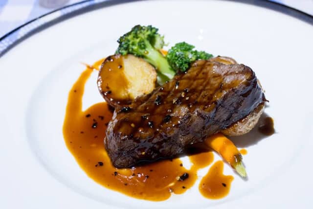 厚さたっぷりの「和牛サーロインの炭火焼」にはローストした野菜が添えられ、トリュフマデラソースをかけた絶品です。プチシェフが焦がしてしまう場面もあるのですが、肉はとっても柔らかで甘みや旨味も広がる絶妙な火入れ具合でした。