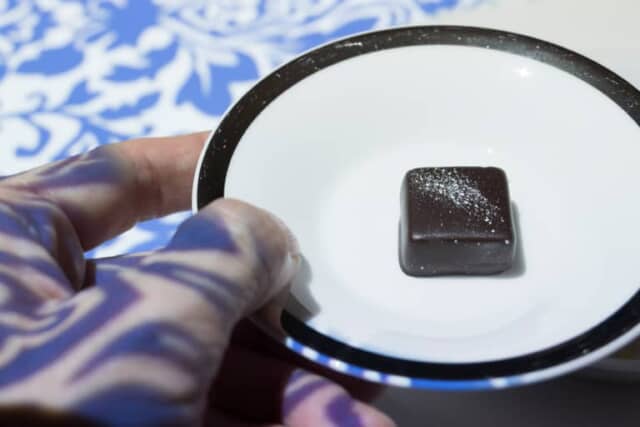 食後のコーヒーや紅茶には、柔らかな生チョコを閉じ込めたプラリネが添えられます。お皿を持ち上げると、投影されたアラベスク模様が手に映り、エキゾチックな気分です。
