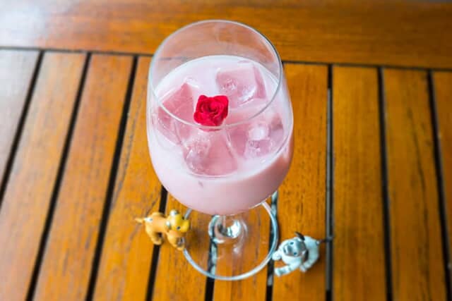 今回のアフタヌーンティーにもれなくついてくるドリンク「aiboのいちごミルク」は、生のいちごピューレを使った優しい甘さのイチゴミルク。アフタヌーンティーの始まりにふさわしくバラの花が飾られた華やかなドリンクです。