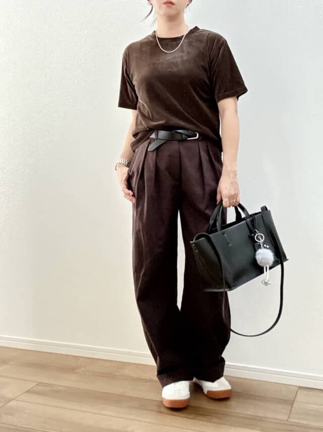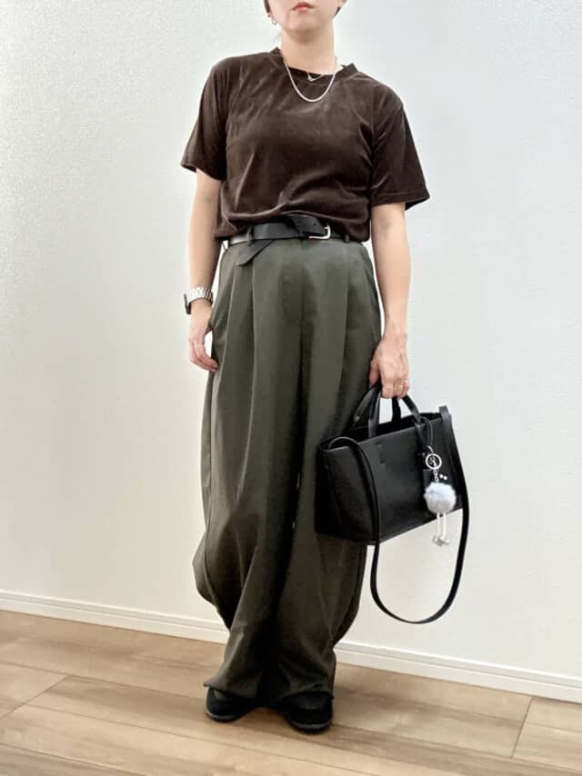 カーキパンツはストレートやワイドなど、風通しが良く体温調節がしやすいシルエットを選ぶと快適。そこに上品なベロアのブラウントップスを合わせれば、日中は軽やか、夜はしっかり秋らしい雰囲気へ。ベーシックな配色でも素材と形を工夫することで、今の季節ならではの“ちょうどいい”着こなしにアップデートできます。