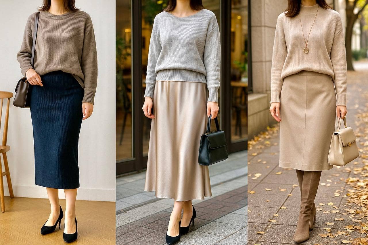 ニットとスカートのコーデは、秋冬の定番中の定番。でも、シルエットや素材の選び方を間違えると、一気に「おば見え」してしまう危険性もあるのです。そこで今回は、【若返り効果】と【スタイルアップ効果】を得られる「アカ抜けコーデテク」を紹介します。