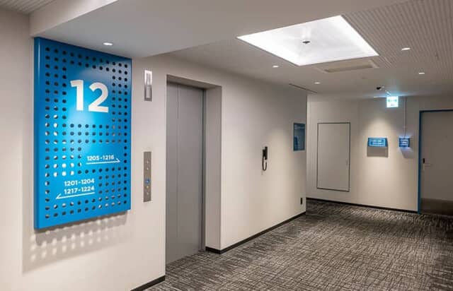 フロアナンバーや案内表示は穴の開いたメタルボードに表示され、市場や工場などのイメージをモダンにデザイン。階によって青か黄色のポップなアクセントカラーに色分けされ、客室のウォールアートやシャワーブースも青か黄色が使われています。