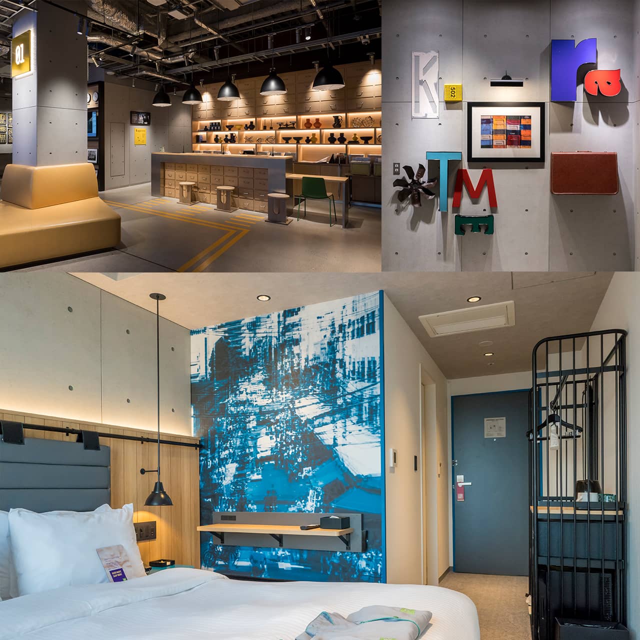 フロアナンバーや案内表示は穴の開いたメタルボードに表示され、市場や工場などのイメージをモダンにデザイン。階によって青か黄色のポップなアクセントカラーに色分けされ、客室のウォールアートやシャワーブースも青か黄色が使われています。