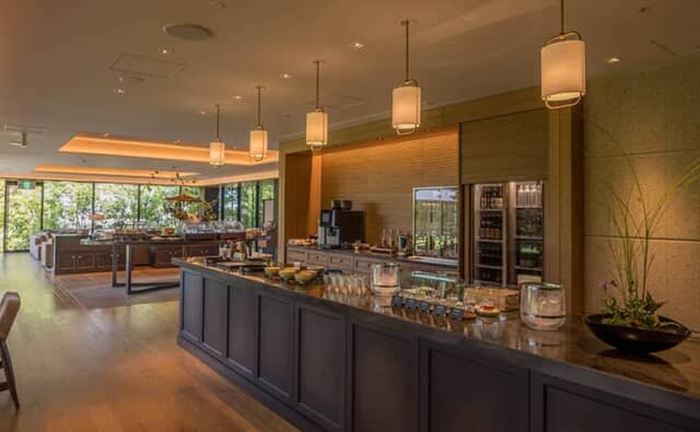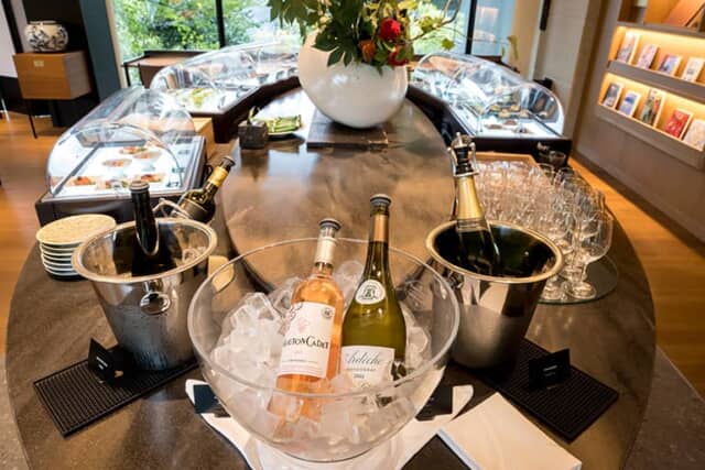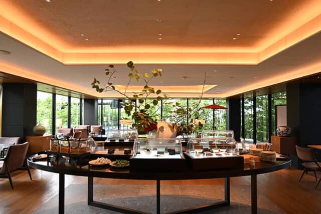 ビュッフェカウンターに並ぶおつまみは時間によってかわります。7時30分から12時まではマフィンやフルーツなどの軽朝食、12時から15時はマカロンなどのおやつやソフトドリンク、お茶などを用意。15時から22時まではワインや日本酒などを楽しめるカクテルタイムで、おつまみなどの軽食が並ぶので、夕食前のアペリティフにおすすめ。抹茶を点てる体験も行っています。