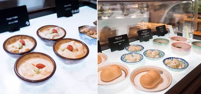 享和3年(1803年)に創業した今出川の老舗「鶴屋吉信」の和菓子も4種類並んでいました。お店を代表する「柚餅(ゆうもち)」は明治元年(1868年)に誕生。柔らかな求肥は柚子の香りと阿波和三盆糖の奥深い甘みを楽しめます。