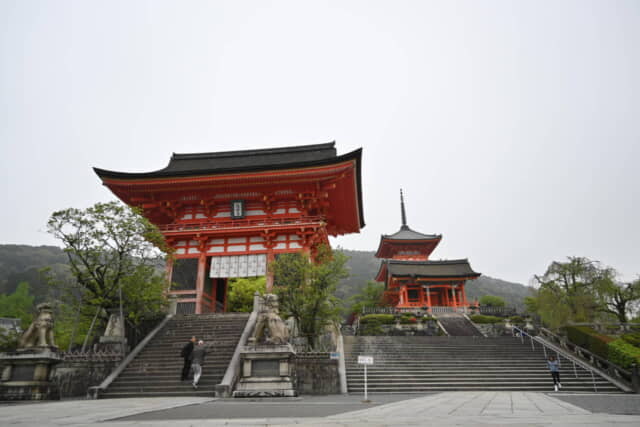 ホテルからは清水坂を上って8分ほどで、清水寺の山門に行き着きます。階段の上にそそり立つ仁王門と三重塔は迫力満点。早朝は人影も少なく、ホテルの朝食前にゆっくりと見てまわれまることができます。
