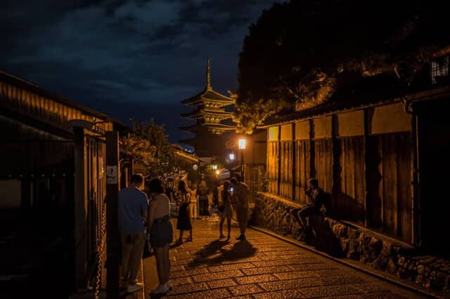 八坂の塔は夜10時までライトアップ。世界中からこの光景を見に人々がやって来ます。皆さん写真を撮りながらとても幸せそう。この夜は海外からのお客さんばかりでしたが、日本人がこの光景を見ていないのが、とてももったいなく感じます。周囲には民家もあるので、静かに楽しむのがエチケット。民家にもカメラを向けないようにしてください。