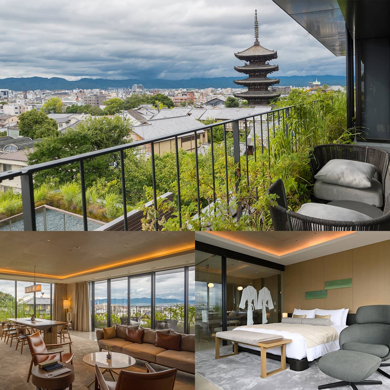 増築棟にある「パノラミックスイート」は京都のパノラマビューを満喫できるシグネチャースイートです。東山の高台からの眺望は素晴らしく、南は京都駅周辺から北の山々まで見渡せるほか、すぐ目の前には清水のランドマークとして有名な八坂の塔が立っています。室内はリビングダイニングとベッドルーム、広いバスルームを備えます。