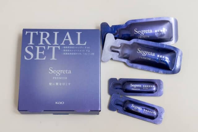 「セグレタ プレミア」のシャンプーとトリートメント、さらに高濃度美容液オイルが2つも入ったトライアルセット。コンパクトで旅行にも便利です。