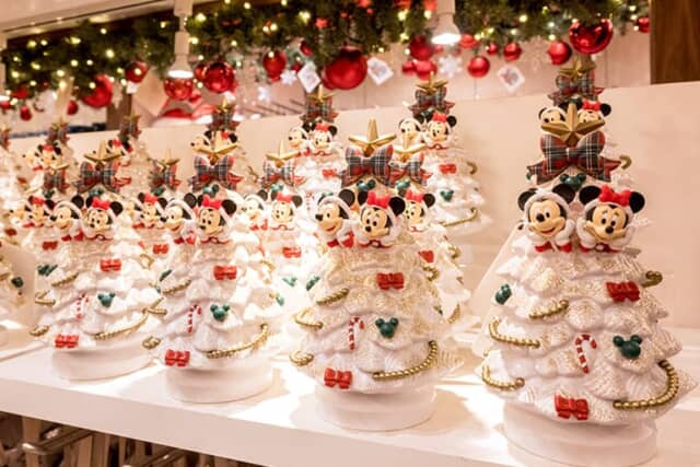 クリスマスプレゼントの入った袋から顔を出しているミッキーのぬいぐるみもお忘れなく。袋から出すと、プレゼントの袋を担いだサンタクロースに変身します!そして、膝の上にリースをのせたミニーもクリスマス気分が盛り上がるアイテムです。
