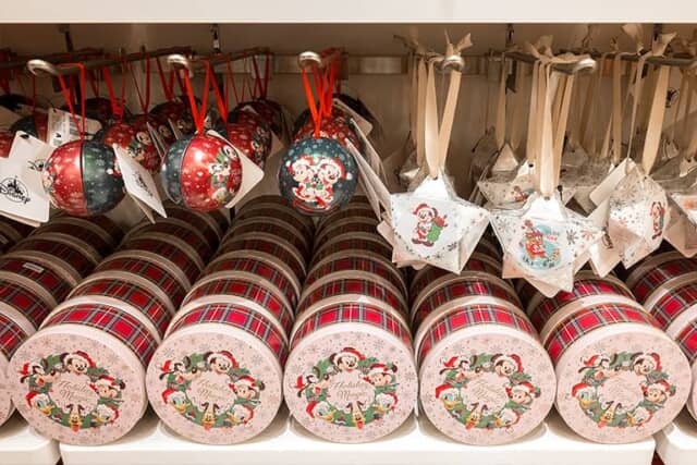 星型オーナメント風のパッケージにミッキーのプリントビスケットが入った「ミッキー&フレンズ ビスケット」(¥650)や、ボールオーナメント風の缶ケースに入った「ミッキー&フレンズ キャンディー 缶入り」(¥800)、キャラクターのオーナメントをあしらった缶ケース入りの「ミッキー&フレンズ クランチチョコレート」(¥1,400)。
