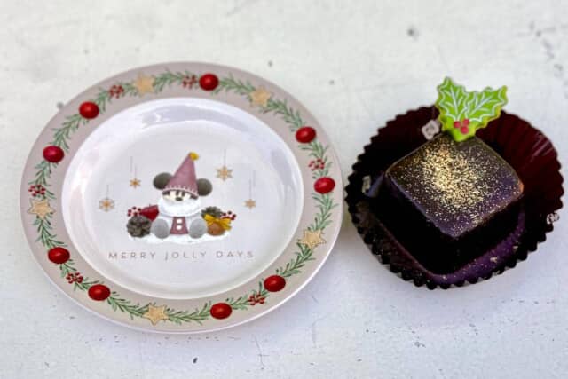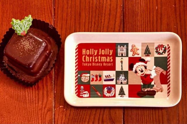 ナッツの食感がアクセントになった濃厚チョコケーキ。雪の結晶やリースが描かれたクリスマスデザインのスーベニアプレート付きで、帰宅後もホリデー気分が続きます。スーベニアプレートは2種類あり、それぞれ販売店舗が異なります。