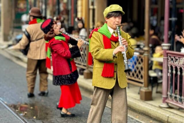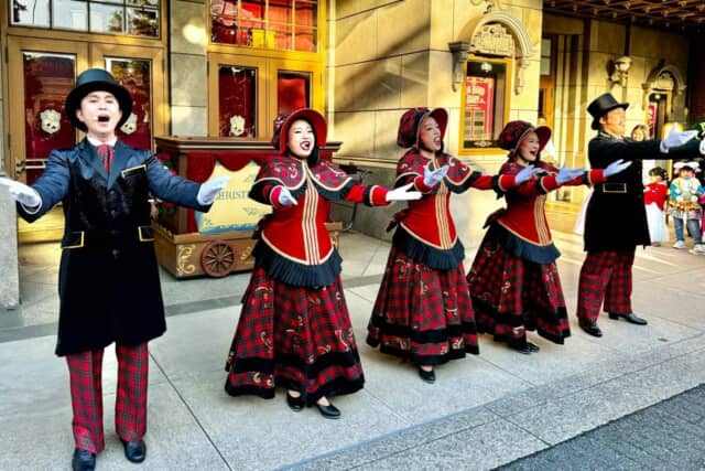 ミッキーマウスやダッフィーたちが登場し、音楽に合わせてゲストにクリスマスのあいさつを届ける温かなミニショーです。