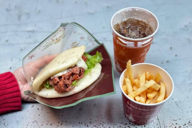 ローストビーフとポテトサラダを挟んだ贅沢サンドウィッチに、フライドポテトとストロベリー&ミルクゼリー、ドリンクが付いたボリューム満点のセットです。華やかな見た目と食べ応えのある内容は、大人ディズニーにもぴったり。