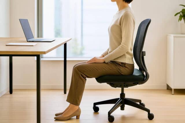 ▲椅子に浅く腰かけて背筋を伸ばすだけで、体幹が自然に働き代謝アップ。座ったままで“燃える姿勢”を意識しましょう