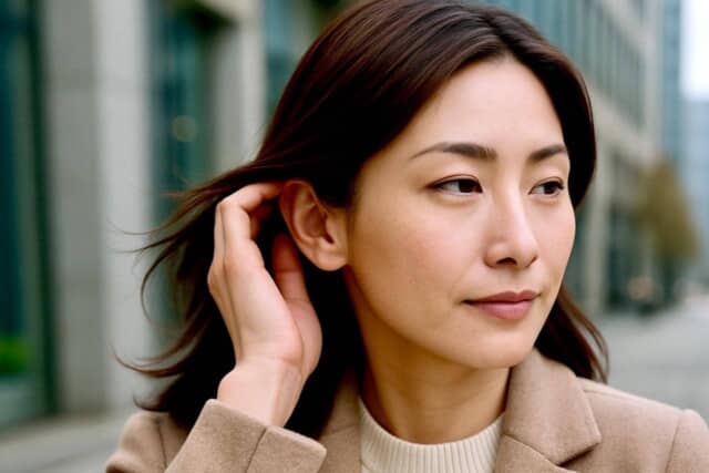 髪がどうしても言うことを聞かない朝は、無理に巻いたり結んだりするより、思い切って“耳かけ”で整えるのが大人の最適解。耳にかけることでフェイスラインがすっきり見え、サイドの膨らみも自然に抑えられます。