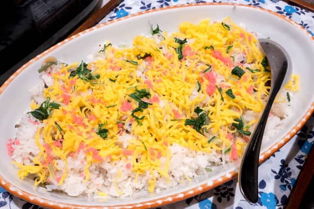 日本海に面した丹後地方の郷土料理「バラ寿司」もおすすめです。彩も華やかで、京風のほんのり甘めの酢にこだわった味つけです。本来は四角く取り分けて食べますが、ホテルではお茶碗に気軽に盛っていただきます。