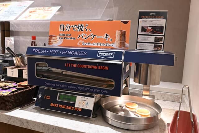 世界初のパンケーキマシーン「POPCAKEⓇ」が設置され、センサーに手をかざすと一口サイズのパンケーキを2枚焼くことがでます。フルーツを添えてアレンジも可能。海外からのお客さんに人気でした。