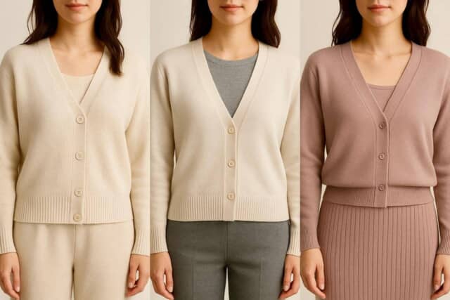インナーがぴったりしたリブニットで、上に細身のカーディガンを重ねる昔ながらの組み合わせ。これは体のラインを拾いすぎて、40代以降の“気になる部分”をすべて強調してしまいます。さらに、素材が薄いとアウターの中でくたっとし、よけいに老け見えすることも。