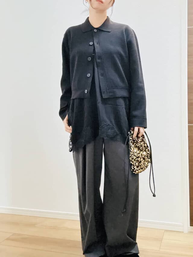 同色のレースキャミを仕込めば、ニットの素材とレースの繊細さのコントラストで季節感や女性らしさがアップ。さらにゴールドの小物を合わせれば、暗くなりがちな冬コーデに華やぎが加わり、大人の余裕を感じるムードに仕上がります。