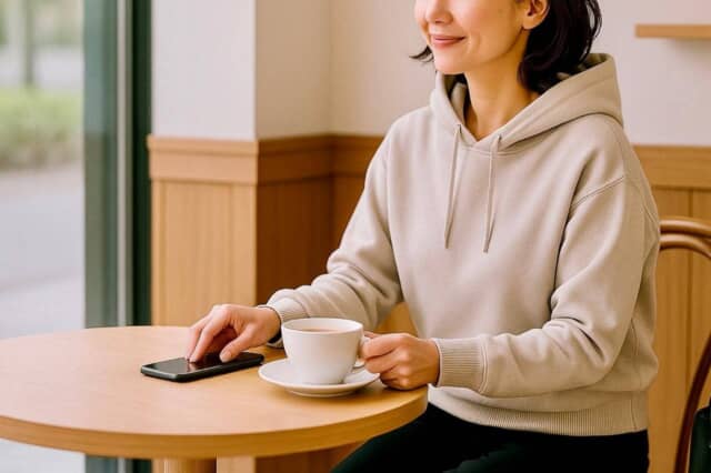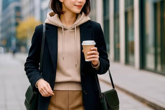 コンパクトなパーカーは、日常のあらゆるシーンで「さりげない上品さ」を底上げしてくれます。コートを羽織った通勤前の一瞬でも、カフェでリラックスしている時間でも、フードがきれいに立っているだけで全体がまとまり、無理なく大人らしいカジュアルに。
