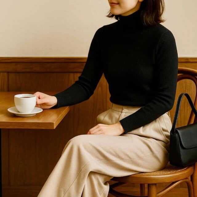 黒タートルは、静止画では固く見えるときがあります。でも、日常の動作の中では一気に表情がやわらぐアイテム。カフェでカップを置くとき、バッグを手に持ち替えるとき、椅子から立ち上がるとき。そんな何気ない所作に、力の抜けた優しさと余裕が宿ります。
