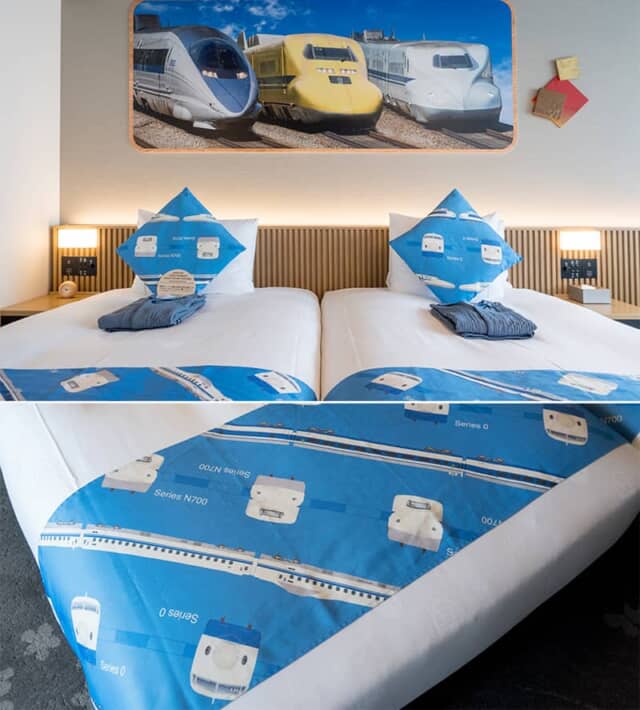 ▲ベッドスローやクッションにも0系やN700系新幹線のデザインがある特別仕様