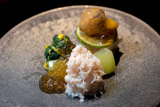 毛ガニのほぐし身に加え、カマスの上には揚げた大黒本しめじが飾られ、コクと酸味が際立つ土佐酢のジュレを和えながらいただきます。