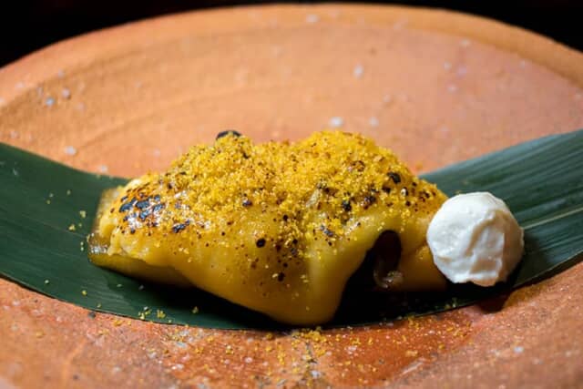 さっぱりとした「カマスと毛蟹の和え物」に続く二品目は、その真逆となる濃厚な味わいの「牡蛎の田楽」。“牡蛎とリンゴのグラタン” をイメージした一皿は、白味噌と卵黄を合わせた玉味噌をのせて焼き上げ、酒粕を加えたクリームチーズが添えられます。リンゴの甘味に牡蠣と玉味噌の濃厚な味は、盃につい手が伸びる趣向です。