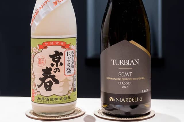 ▲「京の春 純米生原酒 にごり酒」と「ナルデッロ ソアヴェ・クラシコ ヴィーニャ・トゥルビアン」
