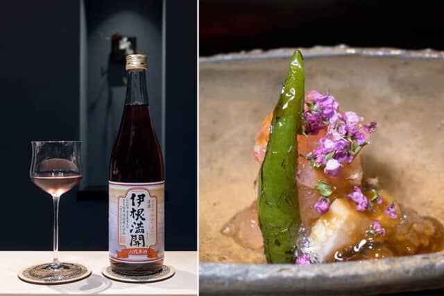 お造りに合わせて、向井酒造を代表的するお酒をペアイング。甘鯛の昆布締めと蒸しアワビには、ポン酢と煎り酒のジュレがかかります。そんな甘酸っぱい料理に合わせたのが、伊根町で復刻栽培した古代米 “紫黒米” と京都産の酒米五百万石を合わせて作ったロゼワインのように赤い「伊根満開」。ポリフェノールやアントシアニンが含まれ、お米の香りとともに旨味やフルーティーな甘味を楽しめる個性際立つお酒です。