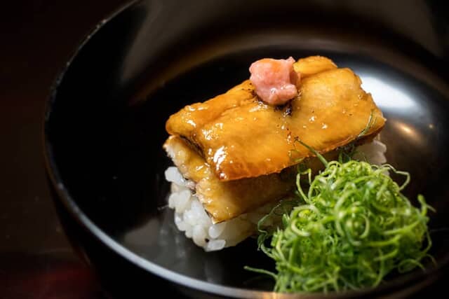 ポン酢や醤油の味が続いた後は甘く奥行きのある鰯の蒲焼が続きます。トッピングされた梅わさびの優しい酸味やピリッとした黒七味にくわえ、シャキシャキ食感の青葱など、いくつもの味が口の中で入れ替わり立ち替わり感じられる一品です。