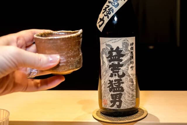 いくらをたっぷり飾る「伊勢海老と無花果の揚げ出汁」には、「おべっさん 特別純米原酒 生酛仕込み」の冷酒と熱燗を用意。伊根町の戎神社のお祭りを “おべっさん” と呼ぶことから名付けられたお酒は、無農薬で育てられた伊根産の雄町を使用。精米歩合は80%でキレのある仕上がりに。温かい餡にひたる奥行きのある揚げ出汁を、キリっとした冷酒と、味が膨らむ熱燗で味わう体験です。