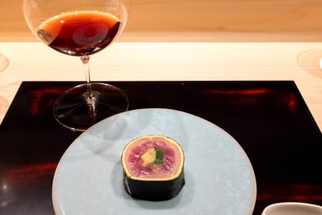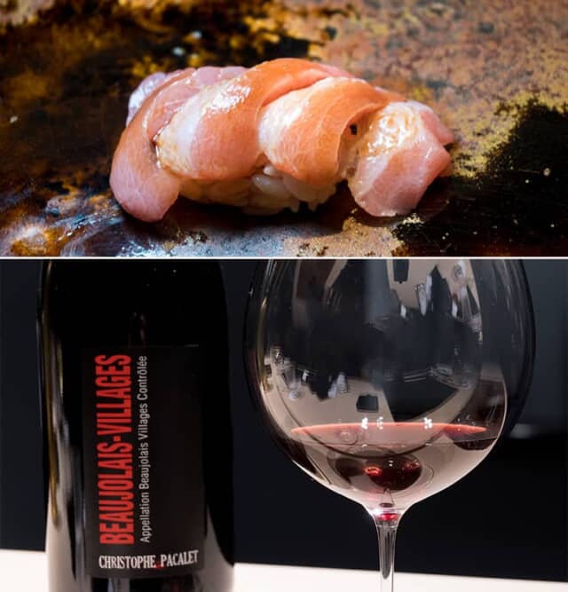 大トロに合わせたのは、自然派ワインで知られるクリストフ・パカレの「ボージョレー・ヴィラージュ」。ブルゴーニュのボジョレー地区で広く栽培されている黒ブドウのガメイ・ノワールを使い、フルーティーな香りと味、爽やかな飲み口は、脂ののった大トロにベストマッチの組み合わせでした。