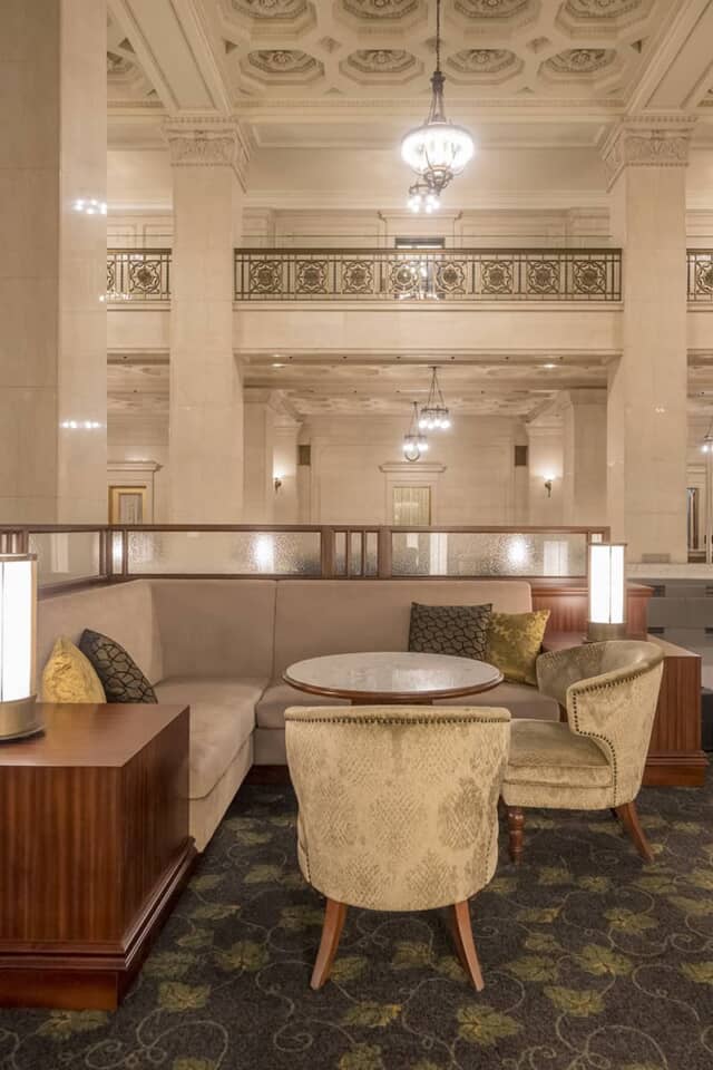 吹き抜けにはイオニア式の柱が26本も立ち並ぶ圧巻の風景。天井が高いので解放感も抜群です。
