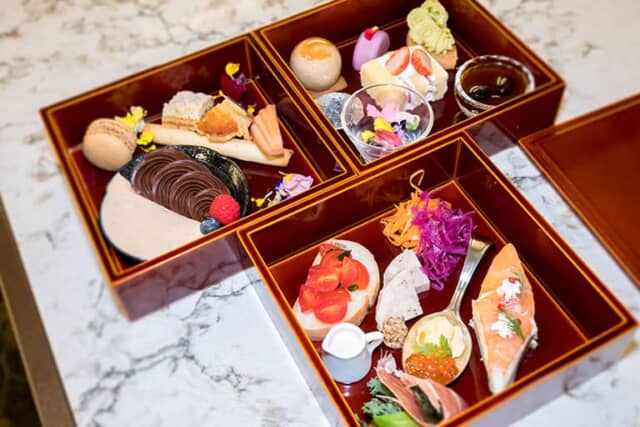 数量限定のアフタヌーンティーは3段重で運ばれます。一の重は和と洋を合わせた生スイーツ、二の重は焼き菓子がメイン。三の重はパテやサンドイッチなどのセイボリーの詰め合わせ。※ドリンク付(ノンアルコールシャンパンを除く)