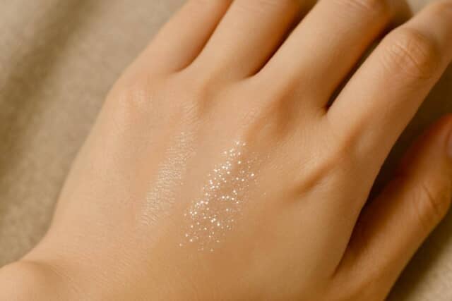 肌とラメの色が調和すると、輝きが自然になじみ、くすみが飛んだような印象に変わります。イエベ肌なら、シャンパンゴールドやウォームベージュなど、あたたかみのある光が得意。一方ブルベ肌は、シルバーやローズピンク、青みのあるベージュが透明感を引き立てます。