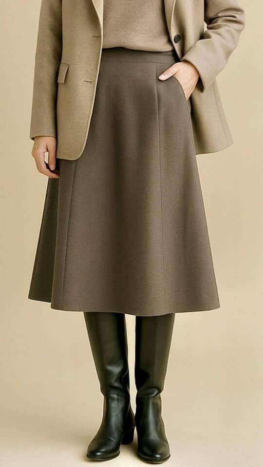 今年のロングブーツは“丈バランス”が命。40代女性におすすめなのは、ひざ下〜ふくらはぎ中間までのミディ丈スカートとの組み合わせ。スカートの裾がブーツに軽くかかることで、脚のラインを自然にカバーしながら脚長効果を演出します。