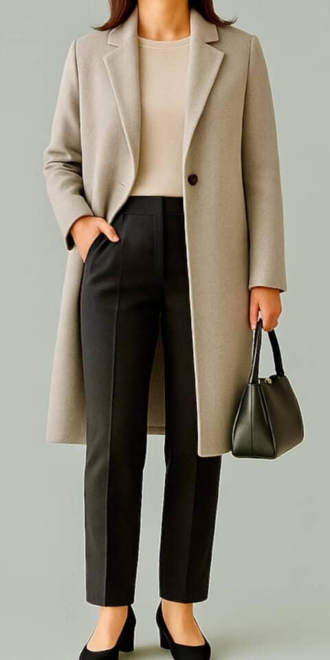 中でも頼れるのが、センタープレスのパンツ、ロングカーディガン、そして前を開けて着るアウター。この3つは、どんな体型でも自然とIラインを作り、すらりとした印象へ導いてくれる万能アイテムです。重ね着をしてもスリムに見えやすく、「冬は太って見える…」と感じやすいならぜひ取り入れましょう。