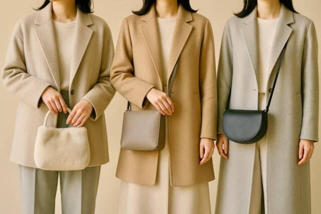 今の気分に寄せるなら、金具控えめ・マット質感の小ぶりバッグがちょうどいいバランス。光りすぎない素材は冬コーデの重さを中和し、静かに洒落感を底上げしてくれます。