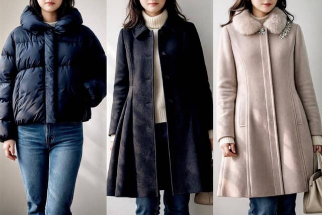 ▲着ぶくれしやすいショートダウンやAラインの膝丈コート、装飾の多い華美なウールコートは、冬コーデ全体を重たく古く見せやすい