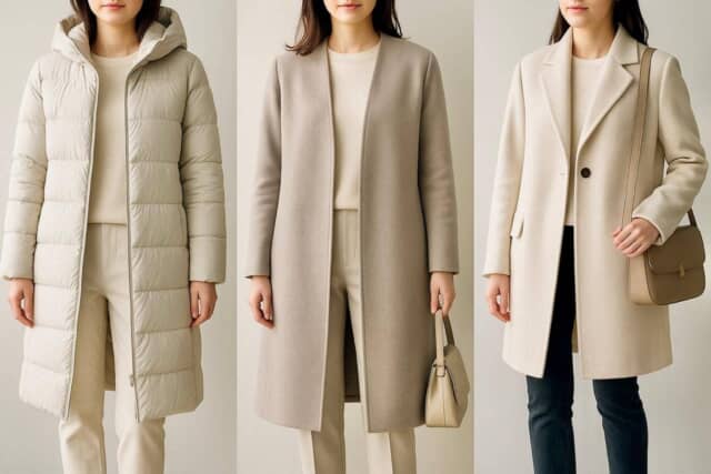 ▲縦ラインが際立つロングダウンやノーカラーのストレートコート、シンプルなテーラードコートは、冬でも軽く洗練された印象をつくる