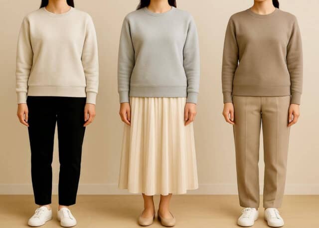 スウェットは何気なく着ても成立する便利なアイテムですが、選ぶ形や素材、合わせるボトムによって見え方が大きく変わります。ゆるさの度合い、表面の質感、シルエットの抜け感。この3つを少し整えるだけで、冬の普段着が一気に垢抜け、軽やかに見えるはず。難しいテクニックは必要ありません。手持ちの一枚も、今日から気軽にアップデートしてみてください。<text:ミミ> ※本コンテンツの画像は生成AIで作成しています