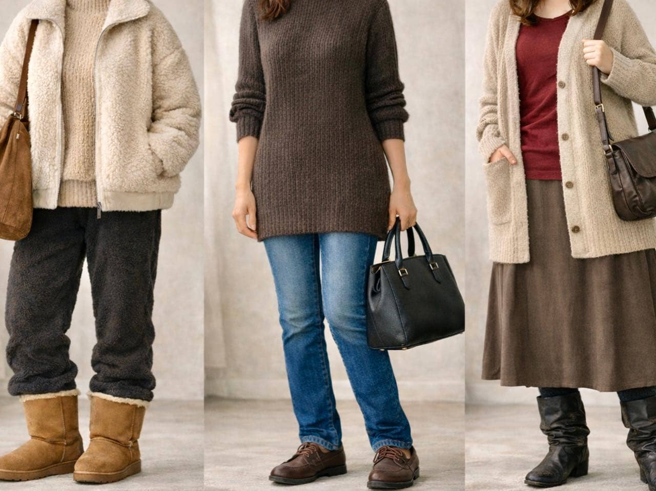 帰省は車移動や室内時間が多く、“暖かさ”を求めるあまり、ボア×ボアや厚手×厚手のように素材を重ねすぎるパターンが目立ちます。たしかに暖かいものの、上半身も下半身も膨張し、メリハリが消えて見えるのが難点。