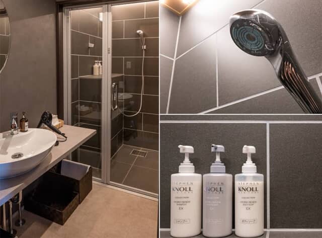 この客室はバスタブのないシャワーブースを備えます。そのうえシャワーヘッドとドライヤーはリファ。シャンプー類は洗い上がりのいいスティーブンノル。テンションが上がる設備です。