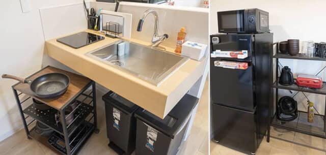 IHクッキングヒーターやフライパン、カトラリーをそろえ、炊飯器もある充実した設備。大型の冷蔵庫には持ち込んだ食材をたっぷり入れられます。黒モノでそろえた家電がスタイリッシュです。