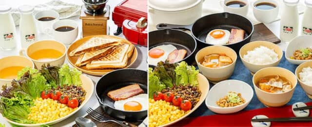 洋食の「モーニングセット」と「和朝食膳」は、1部屋で全員同じセットを選ぶシステムです。和洋どちらも富士山麓産のこだわりたまごのベーコンエッグ(卵かけごはんや焼きベーコンなどにアレンジも可能)や、わずか1kmほどの場所にある「あさぎり牛乳」の瓶牛乳もセットに加わり、ご当地の味を楽しめます。