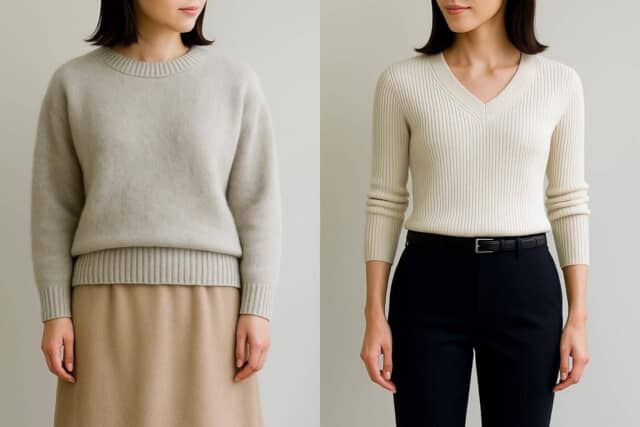 ふわっとしたクルーネックのニットは便利ですが、裾が落ちて腰の位置が曖昧になると、体のラインが下へ引っ張られて見えます。