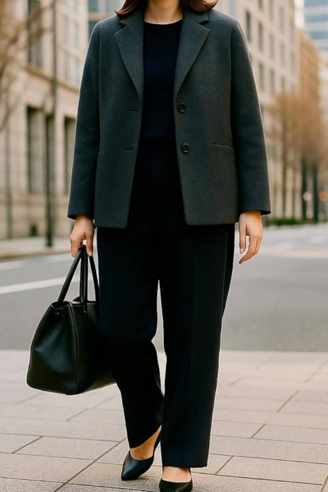 冬アウターで起こりやすいのが、無意識に重心が下がってしまう着こなし。ショート〜中途半端丈のウールコートに濃色トップスを重ね、そこにワイド寄りのパンツを合わせると、縦のラインが途切れて腰まわりが丸く見えやすくなります。