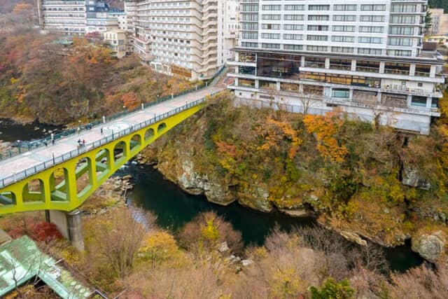 ホテル最上階の9階からは、鬼怒川渓谷を見下ろせます。鬼怒川の観光スポットのひとつ「ふれあい橋」が眺められるほか、訪れた12月初旬は色づいた山々の木々を楽しむことができました。